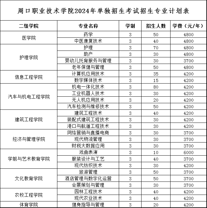 1.我校2024年高职单独考试招生安排招生计划1000人,招生专业及分专业计划以河南省教育厅审核批复后公布的高职单招招生章程为准。2.我校2024年高职单招针对退役士兵单列计划30人,单列计划招生专业为计算机应用技术、机电一体化技术、中医康复技术、汽车检测与维修技术、装配式建筑工程技术五个专业,符合退役士兵资格的考生须在单列专业内选择填报专业志愿。我校单招录取的退役士兵考生须将档案转至学校,全日制在校学习。